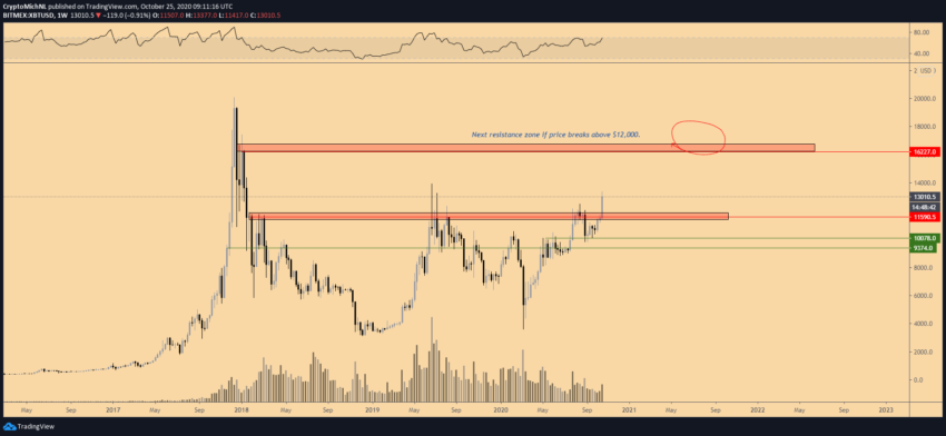 Como muestra el gráfico semanal de Bitcoin, el área de $11.600-12.000 fue un área crucial para romper para cualquier continuación alcista. Esta zona de resistencia ha sido persistente desde el inicio del mercado bajista a principios de 2018. Durante más de treinta meses, el precio de Bitcoin no pudo romper esta zona de resistencia, hasta la semana anterior.