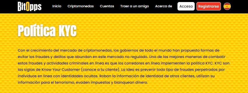 Cuando se trata de adherirse a las regulaciones y políticas, BitOpps se asegura de cumplir completamente con todas las políticas para evitar enfrentarse a cualquier sanción regulatoria. Cuando se trata de la política de Conozca a su Cliente (KYC), BitOpps se asegura de que realiza todas las comprobaciones necesarias y adquiere la información de identificación personal (PII) antes de dejar que cualquier inversor se incorpore.