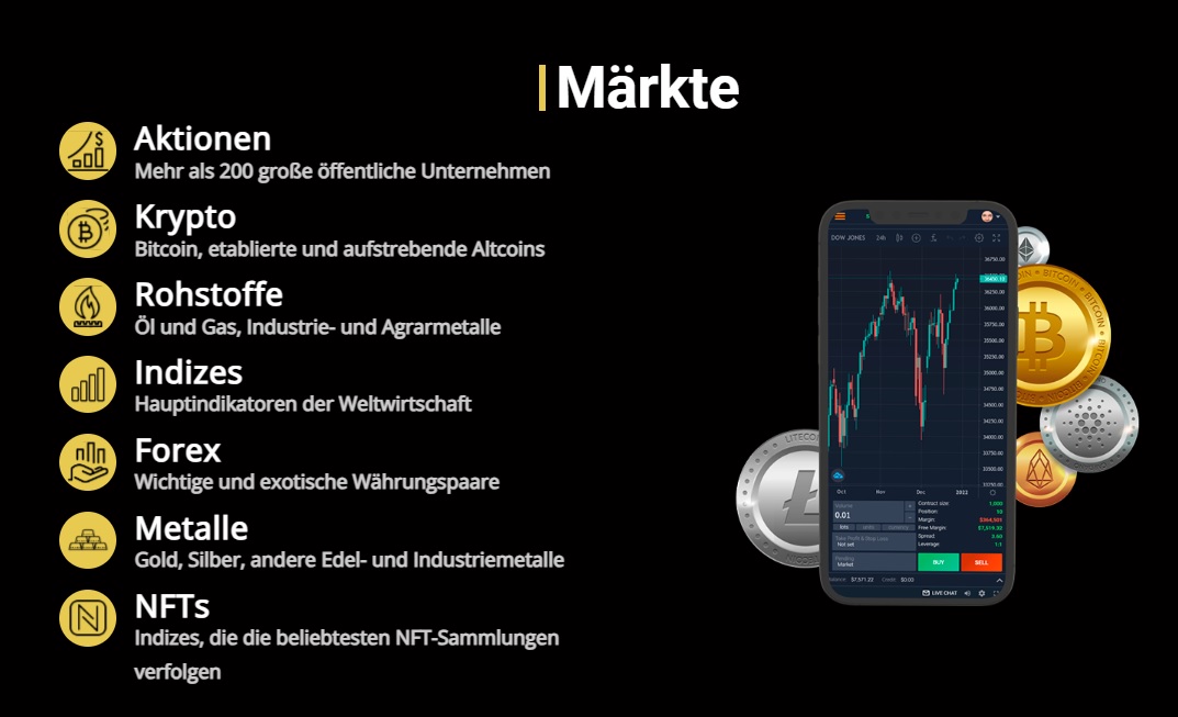 Mit derselben Plattform kannst du zahlreiche Handelsmärkte auf der ganzen Welt betreten. Du musst dich beim Handel nicht eingeschränkt fühlen, da sie dir ermöglicht, 24/7 zu handeln. Du kannst die fortgeschrittenen Handelsfunktionen wie Handelsdiagramme/-grafiken, historische Berichte, automatisierten Handel, Marktnachrichten, Preisalarme, Hebelhandel und viele andere Funktionen nutzen.