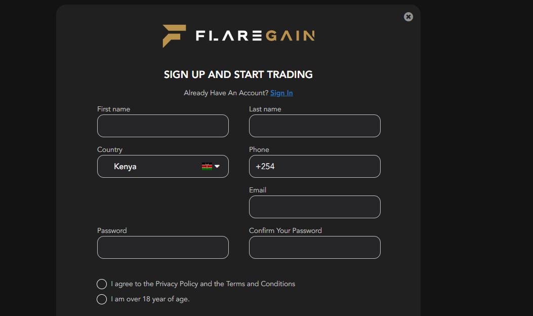 FlareGain verfügt über ein unkompliziertes und schnelles Registrierungsverfahren. Die Einfachheit des Registrierungsverfahrens gewährleistet, dass Sie Ihr Konto umgehend eröffnen können. Um zu beginnen, müssen Sie lediglich grundlegende Informationen wie Ihren vollständigen Namen, Ihr Wohnsitzland, Ihre Telefonnummer und Ihre E-Mail-Adresse angeben und ein Passwort erstellen – einen Schlüssel für Ihre weitere sichere Anmeldung. Der Schwerpunkt liegt hier auf der Einfachheit, um sicherzustellen, dass die Registrierungsschritte benutzerfreundlich sind und leicht durchgeführt werden können.
