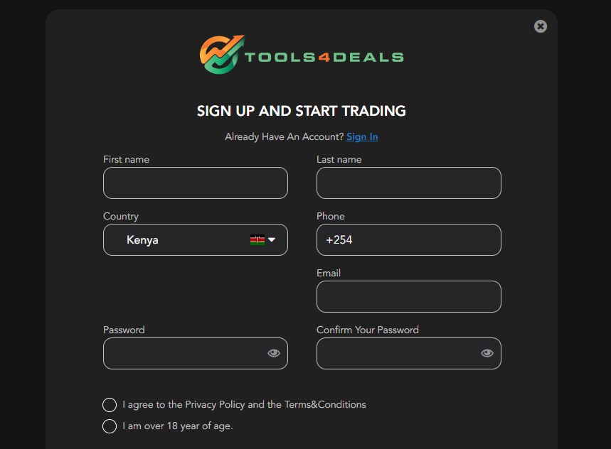 Das erste, was ich über die Tools4Deals-Handelsplattform sagen möchte, ist der schnelle Registrierungs- und Kontoeröffnungsprozess. Es war das erste Mal, dass ich einen so schnellen und einfachen Prozess auf einer Handelsplattform vorfand, daher war ich sehr überrascht. In der Tat gab es ein recht kurzes Formular, in dem nach grundlegenden persönlichen Informationen gefragt wurde. Auf dem Weg dorthin stieß ich auf einen weiteren entscheidenden Schritt. Dieser entscheidende Schritt besteht darin, dass man die Allgemeinen Geschäftsbedingungen und die Datenschutzrichtlinie der Plattform anerkennt und bestätigt.