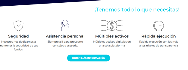 Podrás operar en todas las criptomonedas importantes: Bitcoin, Ethereum, Ripple, Litecoin, Dash, además de las Stablecoins. Puedes financiar tu cuenta con Visa o Mastercard en Dolares, o coordinar otro medio de pago/moneda Fiat con el equipo de cuentas.