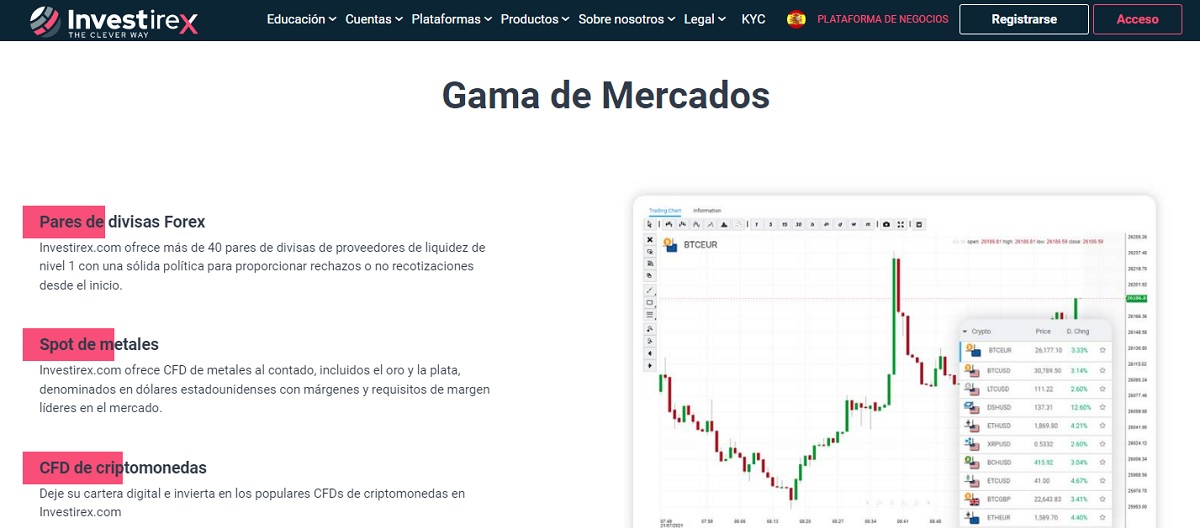 La primera ventaja de adoptar los servicios de Investirex es la amplia gama de activos disponibles. Los clientes tienen ahora acceso a los mayores mercados financieros del mundo y a los activos más valiosos de cada uno de ellos.