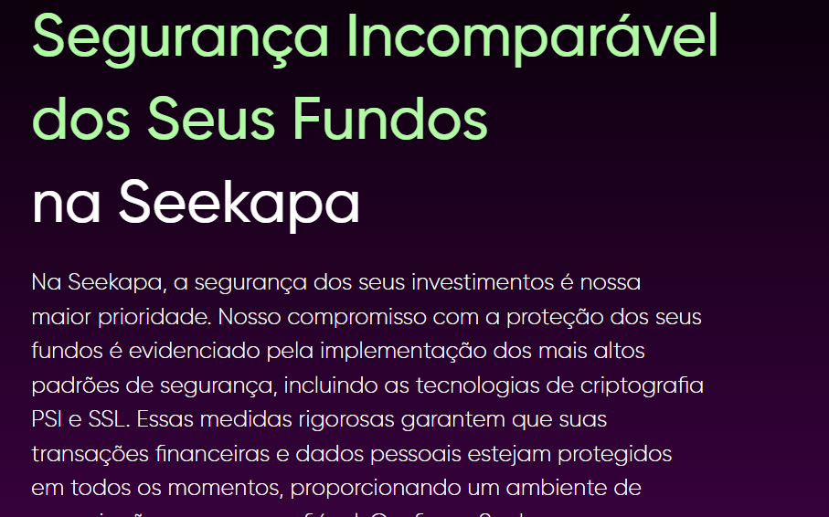 No que diz respeito à segurança, a Seekapa adota protocolos avançados para proteger dados e transações, com sistemas de criptografia e autenticação. Isso garante que as operações do usuário estejam protegidas contra acessos não autorizados.